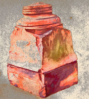 I watched the crab-apple shadows as they fell across the antique post, reminding me of the two only-children and their two only-perspectives, living there together in the old house. I sighed, wondering about a man who would plant an immovable relic in his yard, and the woman who would carelessly crisscross it with a hybrid population of catalog apple trees. My father, for his part, was content to paint the relic, as it stood, on Arches 140 lb - in yellow ocher and brown madder. My mother would bake hers, over and over, every season, on long afternoons in her long Victorian kitchen, occasionally stopping to direct Riley on some important yard task.
