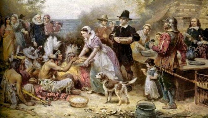 Taped to our refrigerators this time of the year, there are craft paper drawings of belt-buckle pilgrim hats and horns of plenty. Crayon sketches of indians and pilgrims sitting peacefully together sharing the abundance of the season.