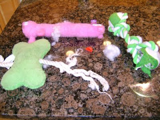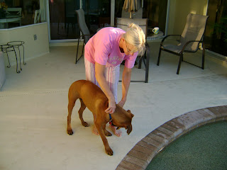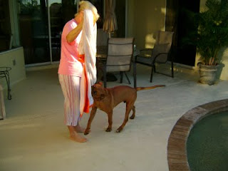 Rocket the dog went happily into his crate at 10pm and, like our other children never did, slept through the night. He failed the cat test for day two (not even a D-) and baby looked like he was posing for a Halloween picture. Rocket ventured into the pool. He chewed through three expensive toys and gagged up some kind of red plastic thing. He also ate the cat's treats that Julie put our because she felt sorry for them. "Where are those treats I left out for the cats?"