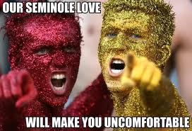 It was impossibly larger than real life; like it could only have been created by a gigantic glitter-boy generator. There were sequined drum majorettes, spinning their batons high into the blue fall sky, conducting uncontrollable expressions of joy. The sun sparkled off of the band in strobing flashes of light. Among hats and helmets, pom poms and round-off flips, a Seminole warrior atop an appaloosa charged onto the field and plunged a flaming spear of defiance into the turf.