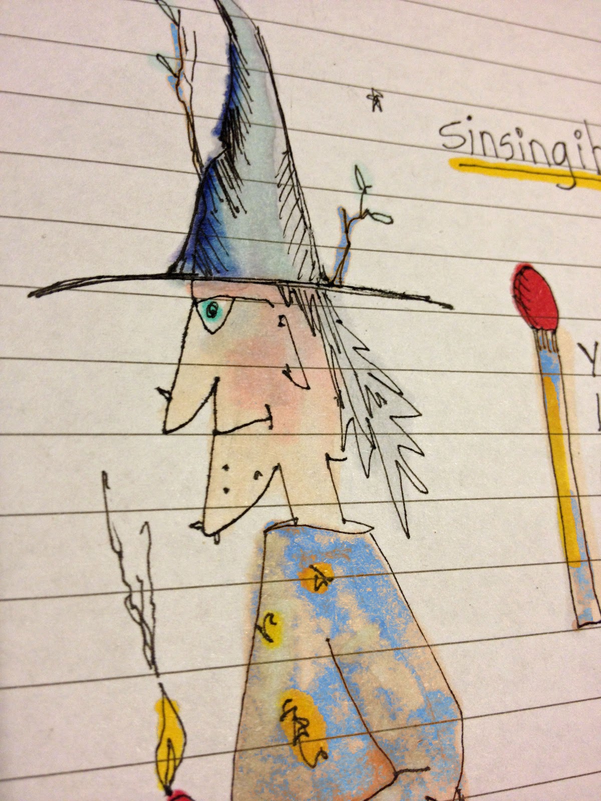 At bedtime, in the days when everyone could fit into the same bed, we'd listen to the witch stories, and my father would draw them as he told them. I oddly remember his hairy fingers gripping his Turquoise Pencil or his felt-tip pen. The pictures were never really the same, but we didn't care - or probably even notice at the time.